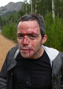 Really, I felt fine. I lowered, Wes put a sweatshirt on my head and we walked out, freaking people out on the trail, and thought about just going to the bar – fuck it. But we went to the ER first, good thing – 13 staples in my head and 14 stitches in my face and mouth. Just what I need – I got uglier.