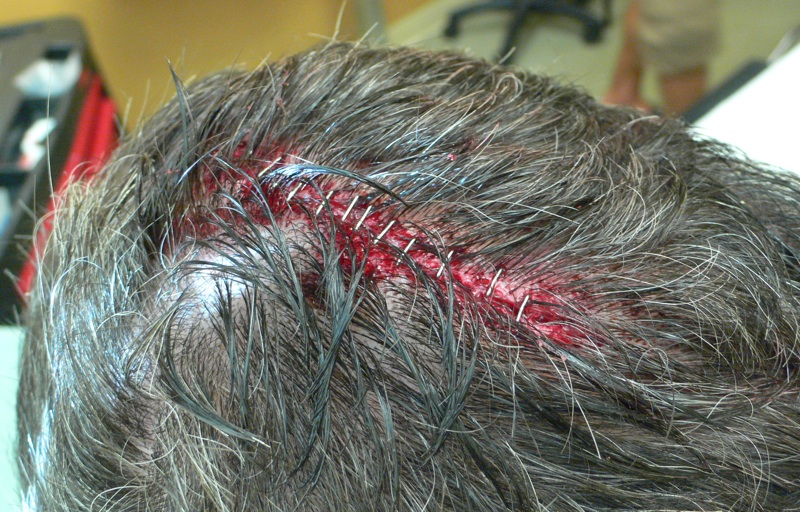 I was not wearing a helmet. I’d been getting complacent when cragging on good rock – stupid, yes. But maybe not? I have no problem attributing blame to myself, for sure, but overhanging sport climbing without a helmet, on good rock, must be the single safest form of climbing. I’ll bet the “if you’d have worn a helmet” thing is, maybe, what? one in 10,000 with this scenario? Seriously, just stay inside. No, for real, stay on the couch and watch TV. Nothing will hurt you there. Then again, had I broken my skull or neck (though the helmet wouldn’t have likely prevented a neck injury anyway), that one case would’ve been catastrophic. Makes me shudder to think about. Just like if my rope would have cut and killed me – also extremely rare – I’d have wished I’d been climbing on double 11mm ropes. I don’t want to be defensive, but I also hate how anytime there’s an accident, every douchebag in the universe tries to jump to one single thing that would magically be the panacea for all evils, accidents, and tragedies in the universe (and such reactions often seem suspiciously close to the shallow self-justification of “Well, you wouldn’t catch me don’t that” – yes, you’re right, we wouldn’t, because you were inside on the couch). It’s weird, like, sure, a helmet would’ve helped some. I almost surely wouldn’t have the staples in my head (the least of my worries…), but would probably still have the gnarled-up face. So, IF I