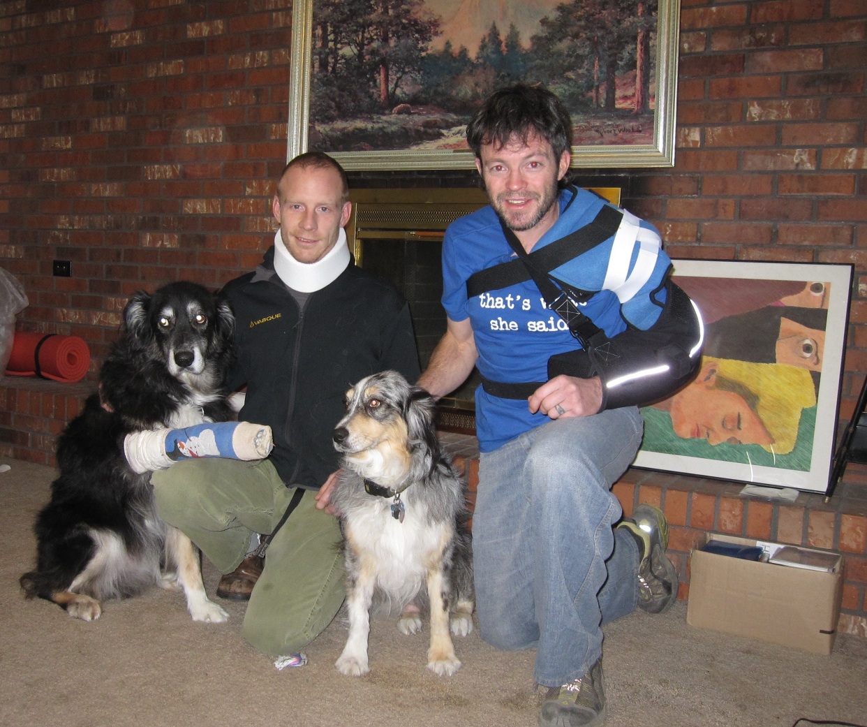 “You stay,” Craig said, shutting the dogs inside. I was at his place in Fort Collins to take him to the hospital. Tally looked at us with sad eyes and perky ears, and Charlie, Tally’s brother and absolutely the sweetest dog in the world, thumped his Santa Claus cast against the floor – every time he goes in for a cast change, the vet school students paint a new design. “Man, Tally’s got the worst farts,” Craig said. “Afraid she’ll drive away all the hot nurses.”
